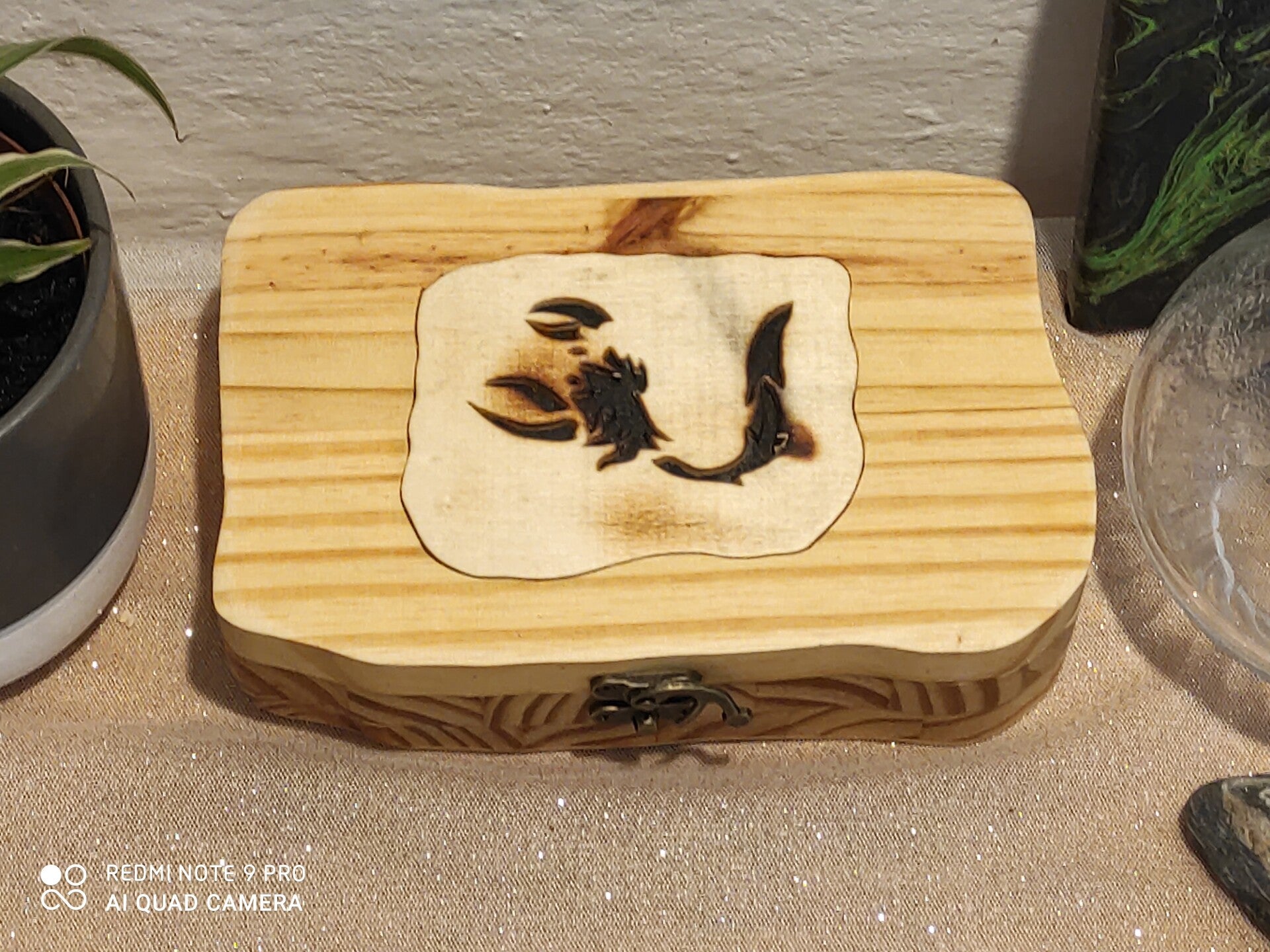 Le scorpion, symbole d’énergie intense et de renaissance, confère à ce coffret une aura romantique et protectrice, invitant à déposer des trésors précieux ou des souvenirs chargés d’intention et de sentiment.