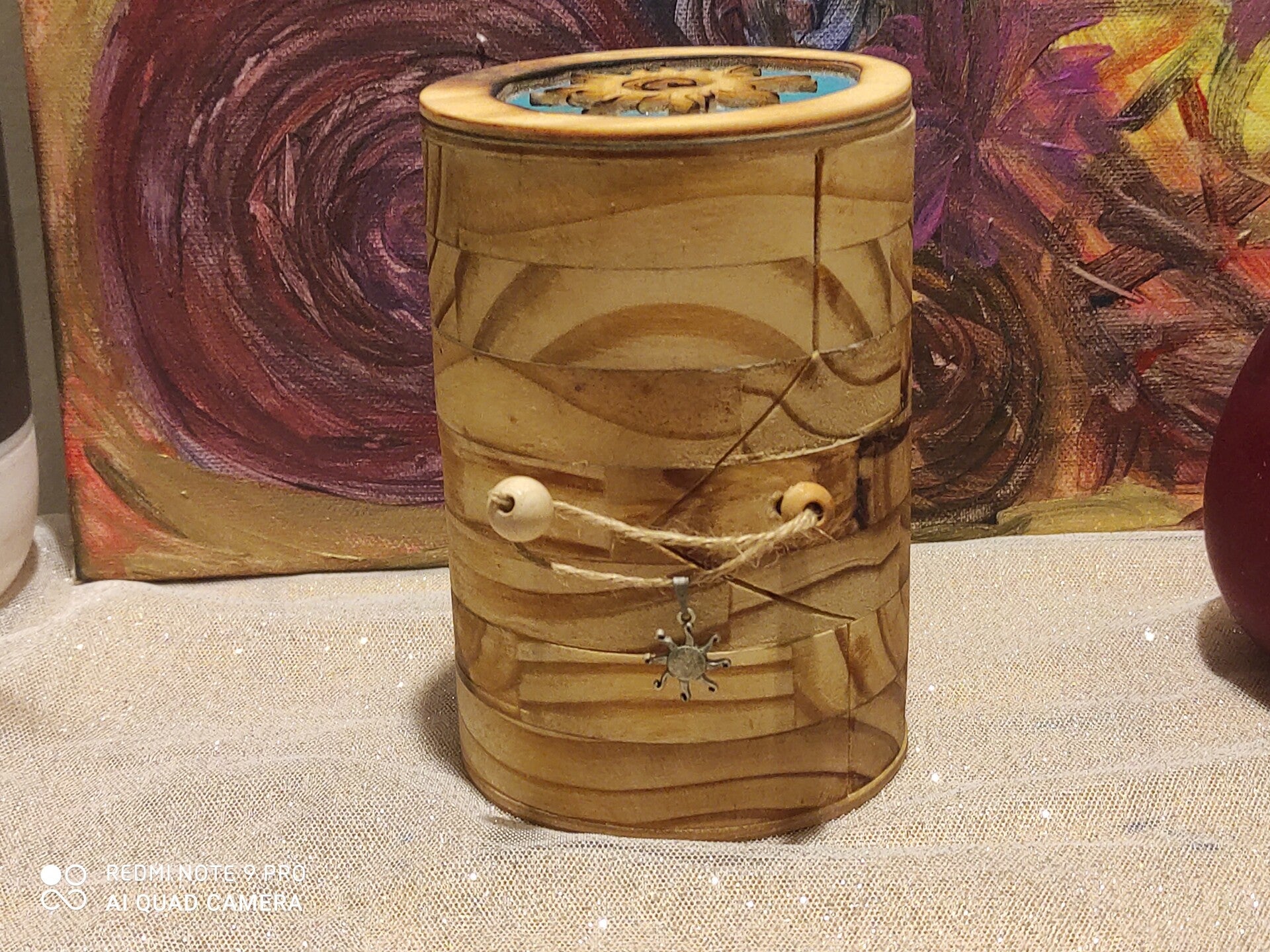 Sur ce coffret rond et élégant, un soleil tribal finement chantourné se détache sur un fond bleu profond, symbole de sérénité, énergie et clarté intérieure.